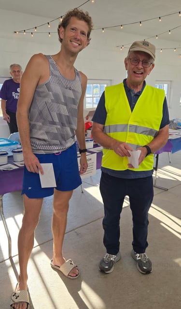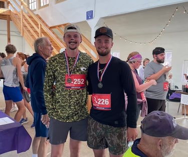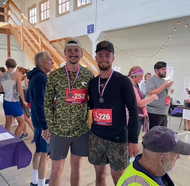 Spencer Hutchison (bib # 226) 2nd in men's 21-30 age group and Scottie Siese (bib # 252) 3rd in same group, wearing 5k medals they won.